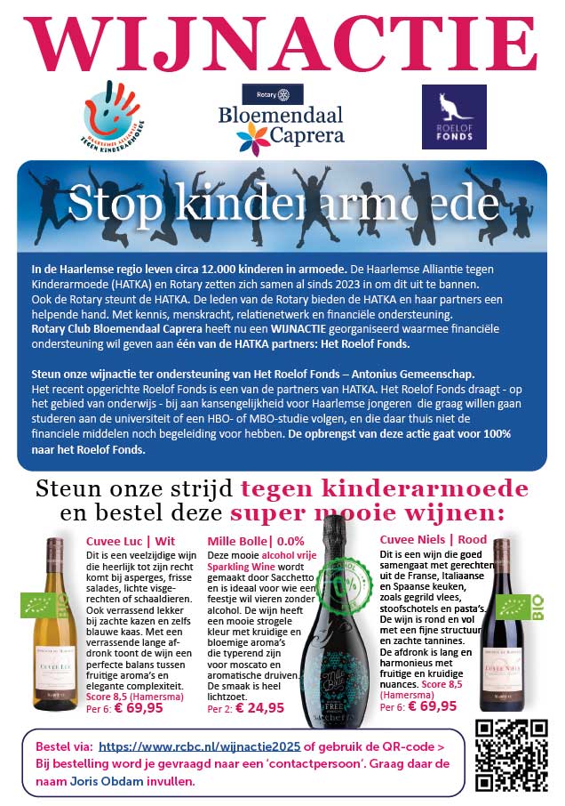 Rotary Club Bloemendaal-Caprera zorgt ervoor dat de opbrengst van deze wijnactie voor 100% ten goede komt aan het Roelof Fonds.  Het Roelof Fonds biedt Haarlemse Jongeren die om wat voor reden dan ook ondersteuning nodig hebben bij het volgen van een opleiding een studiebeurs en begeleiding. (Lees er hier meer over.) De Rotary helpt zo mee met de strijd tegen kinderarmoede en steunt onder andere ook de HATKA. Wij zijn ze daar zeer erkentelijk voor!