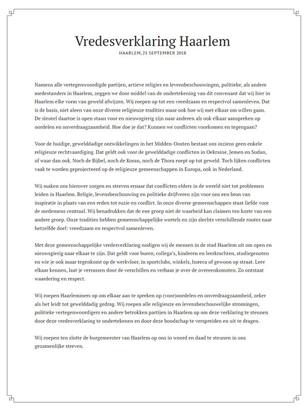 Sindsdien hebben tientallen organisaties die actief zijn op maatschappelijk, religieus of politiek terrein deze Vredesverklaring Haarlem ondertekend. In samenwerking met Bureau Discriminatiezaken Kennemerland, een onafhankelijke organisatie die werkt aan het stimuleren van een tolerante samenleving en het tegengaan van ongelijke behandeling, roept de Antonius Gemeenschap alle ondertekenaars op om elk jaar de intentie om te zetten naar een vredesgerichte activiteit.